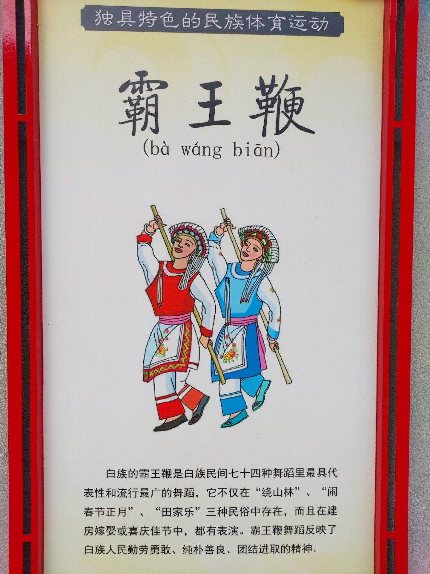 白族的霸王鞭是白族民間七十四種舞蹈里最具代表性和流行最廣的舞蹈,它不僅在“繞山林’”、“鬧春節(jié)正月”、“田家樂” 三種民俗中存在,而且在建房嫁娶或喜慶佳節(jié)中,都有表演。霸王鞭舞蹈反映了白族人民勤勞勇敢、純樸善良、團(tuán)結(jié)進(jìn)取的精神。