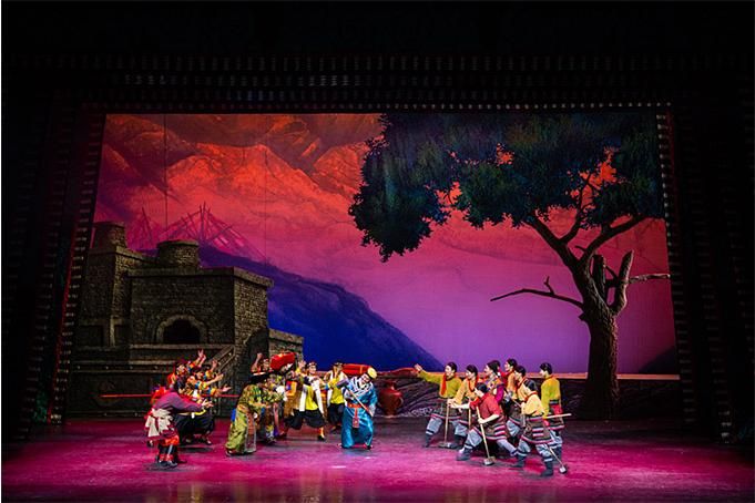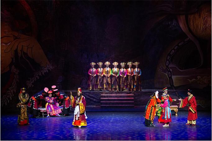 在手段創(chuàng)新上,主創(chuàng)人員在嚴(yán)格遵循南木特藏戲藝術(shù)傳統(tǒng)和戲劇原則的基礎(chǔ)上,設(shè)計了部分新的唱腔,使用了現(xiàn)代舞臺的舞美和聲光電手段,采用了26人組成的中型民族樂隊,從而營造出了全新的舞臺效果。在藝術(shù)手法上,還采用了以南木特藏戲手段表現(xiàn)西藏藏戲內(nèi)容的特殊表現(xiàn)形式,以戲中戲的重疊盡顯不同風(fēng)格的藏戲風(fēng)采,大大地豐富了表演手段和出彩看點,為觀眾提供了巨大的想象空間。