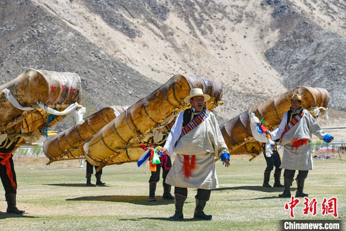 資料圖為西藏拉薩曲水縣俊巴漁村村民穿著盛裝表演牛皮船舞。 記者 貢嘎來松 攝