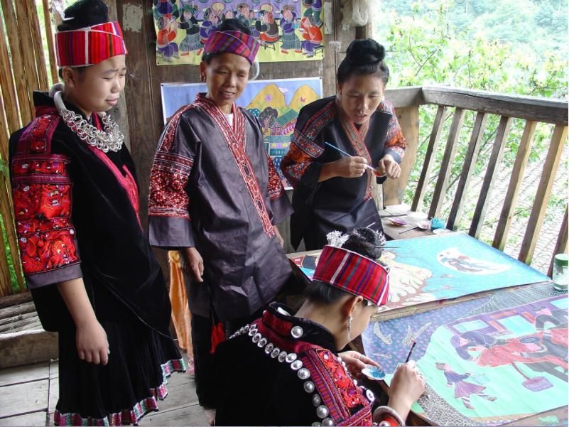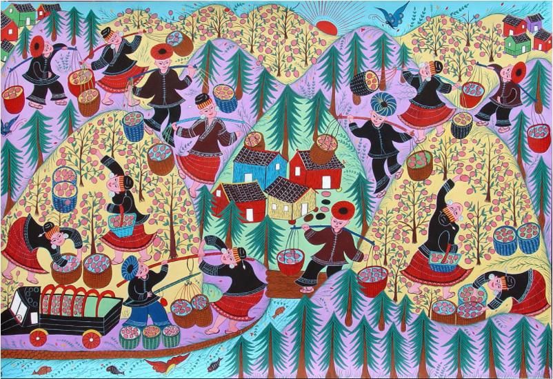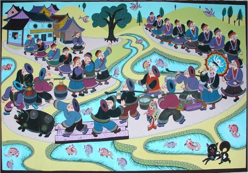 劍河現(xiàn)代民間繪畫源于傳統(tǒng)的苗族刺繡文化,是苗族刺繡文化的另一種表現(xiàn)形式和藝術(shù)升華。傳統(tǒng)的苗族文化多以服飾、歌舞為載體,并以刺繡及演唱等形式進行表現(xiàn)和傳承。早期劍河現(xiàn)代民間畫即脫胎于具有適用性的苗族刺繡樣稿——剪紙和手繪刺繡粉本,換言之,手繪的苗族刺繡粉本便是劍河現(xiàn)代民間繪畫的雛形,劍河第一批優(yōu)秀的現(xiàn)代民間畫作者,即是原當?shù)厥掷L粉本的能工巧匠。劍河現(xiàn)代民間繪畫多以苗族神話傳說中的故事情節(jié)和民俗節(jié)日、生產(chǎn)活動等內(nèi)容為題材入畫,素材涵蓋自然界花鳥蟲魚及人物、家畜等具體形象,造型稚拙天真,設色濃艷,對比強烈。作品傳達出典型的地域民俗氣息及濃厚的鄉(xiāng)土味,便是其標志性特征。