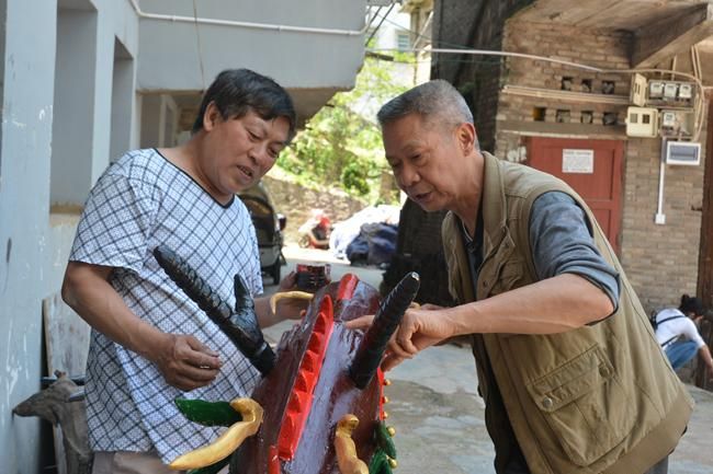 家住鎮(zhèn)遠(yuǎn)縣?陽(yáng)鎮(zhèn)東關(guān)社區(qū)的皇安東,今年68歲,雖然年近古稀,但精氣神堪比五十來(lái)歲的中年人,皇安東介紹由于個(gè)人愛(ài)好,8歲時(shí)與龍舟接下了深厚的情緣,對(duì)“龍”文化研究的執(zhí)著像一如往日對(duì)戀愛(ài)的投入充滿激情和憧憬一樣,經(jīng)過(guò)60多年的龍舟文化研究探索,他手工雕刻的龍頭威武靈動(dòng)融匯鎮(zhèn)遠(yuǎn)傳統(tǒng)文化精髓,“鎮(zhèn)遠(yuǎn)賽龍舟”已被列為國(guó)家非物質(zhì)文化遺產(chǎn)項(xiàng)目名錄。皇安東49歲開(kāi)始自學(xué)雕刻龍頭,鎮(zhèn)遠(yuǎn)端午節(jié)每年祭祀用的龍頭幾乎出自他手,雕刻的龍頭已上數(shù)百頭。當(dāng)筆者提到皇安東為何歷經(jīng)六十多年對(duì)雕龍頭的“手藝”癡心不改時(shí),他笑著爽朗地說(shuō):“我一生雕龍頭,主要的精神動(dòng)力是對(duì)鎮(zhèn)遠(yuǎn)傳統(tǒng)龍舟文化的熱愛(ài)和傳承?!被拾矕|一家人整天在“龍”的藝術(shù)空間里過(guò)得有滋有味。