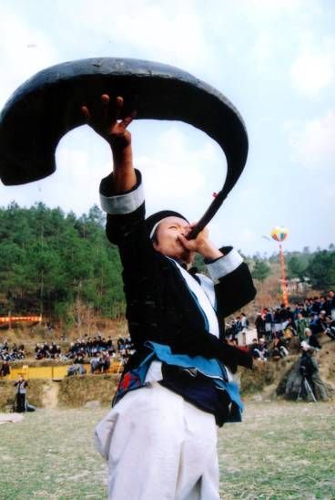 (白褲瑤同胞吹響牛角號)
