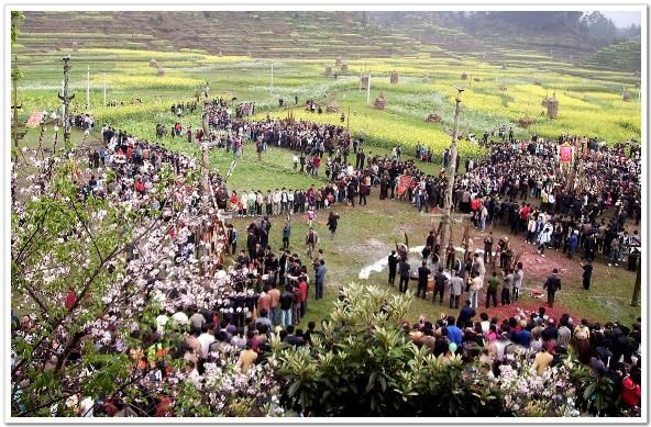 節(jié)日當天,一大清早,人們穿上節(jié)日的盛裝,翻山越嶺地從各條大路小路往坡會地匯集。山坡上、田垌里、公路邊到處擠滿了看熱鬧的人群。