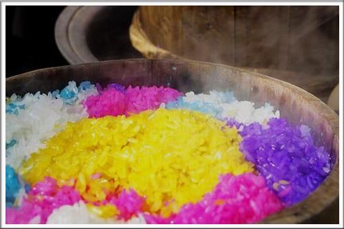 節(jié)日之前,苗族婦女就從山上采集楓葉和野榛葉,用鐵鍋煮開,倒進盆子,冷卻后,將白花花的糯米放入盆子浸泡。節(jié)日當(dāng)天早上,苗族婦女們早早起來,將裝有染色糯米的木箕放在三腳架的鐵鍋上,燒起火慢慢地蒸。約一個小時過后,木箕里的糯米蒸熟成糯米飯,散發(fā)滿屋的芳香。這時,苗族婦女就將糯米飯倒進飯盆,用手前后翻轉(zhuǎn),直到糯米飯里的水蒸氣全部散發(fā)。