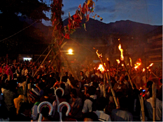 白族視火為生命與靈魂的護(hù)佑物,古有火崇拜習(xí)俗,火把節(jié)是白族對(duì)“生之禮贊和死之緬懷的節(jié)日”?;鸢压?jié)這一天,各村由年內(nèi)新添子嗣之家作“會(huì)首”,在場壩中豎一高大的火把,常年扎十二臺(tái),潤年扎十三臺(tái),頂端扎升斗旗幟,上書“風(fēng)調(diào)雨順”、“五谷豐登”字樣,下懸花紅、梨子、銅錢等物。天擦黑點(diǎn)燃火把,會(huì)首們以糖果、炒蠶豆、煙、茶、酒招待相聚在場壩中的老小。兒童則一手持小火炬,一手往火炬上撥灑松脂粉沐相戲,對(duì)新生的嬰兒表示致賀禮贊。與此同日,新亡故者之家人須上墳祭祀,在新故者墳前或大門口豎一小火把,如是者三年,表示對(duì)死者的緬懷,與史書“星回日祭祖”的記載相合。