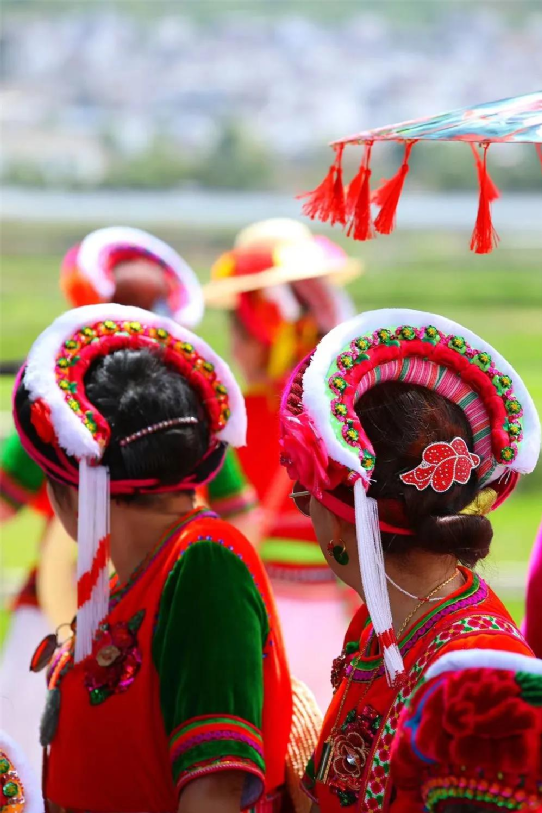 在白族女子的包頭頭飾上,蘊(yùn)含著一個(gè)大家非常熟悉的詞語:風(fēng)花雪月。垂下的纓穗象征下關(guān)的風(fēng),艷麗的花飾象征上關(guān)的花,帽頂?shù)臐嵃资巧n山雪,彎彎的造型是洱海月,足見白族群眾的精巧靈思。