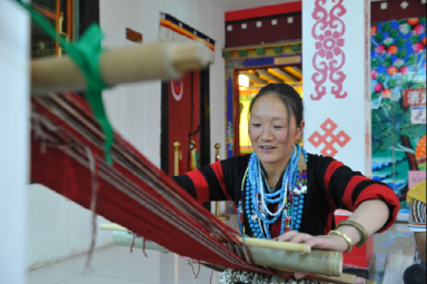 在自治區(qū)群藝館的展出現(xiàn)場(chǎng),除卻這些光鮮亮麗的民族服裝之外,另一個(gè)特殊群體也同樣吸引了眾人的目光,他們便是從西藏各個(gè)地區(qū)前來為觀眾展示藏裝制作工藝的民間手工藝人。他們有的在織布,有的在裁剪,有的在穿針引線做靴子、縫制衣服,這些數(shù)以萬(wàn)計(jì)的、平凡而又偉大的民間手工藝人們,用他們幾十年如一日的堅(jiān)守,默默地承擔(dān)著民族文化創(chuàng)新與傳承的歷史使命。