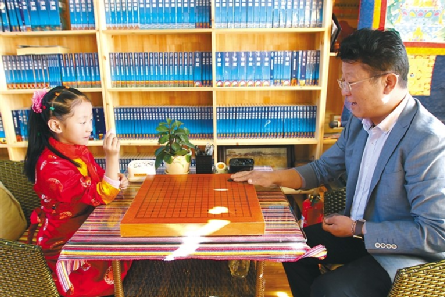 西藏自治區(qū)藏棋協(xié)會(huì)秘書長(zhǎng)阿旺邊巴正在與孩子下棋。