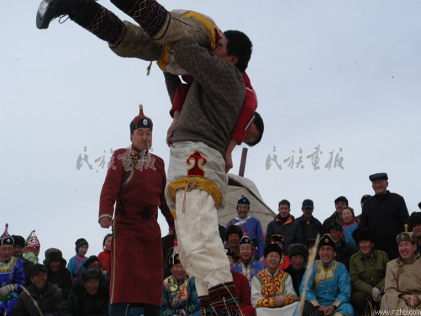 春節(jié),蒙古人稱為“白節(jié)”、“大年”,是蒙古人傳統(tǒng)節(jié)日,時(shí)間在農(nóng)歷正月初一。居住在農(nóng)村、城市、工礦區(qū)的蒙古族過春節(jié)的習(xí)俗同漢族差不多,但牧區(qū)有許多不同的特點(diǎn)。除夕之夜為“守歲”,合家老小席地坐在蒙古包中的矮桌周圍,桌上擺著一盤盤香噴噴的肉類、奶食品,以及糖果、香煙、美酒等物,有的還要在矮桌上供一張大紙,紙上寫著祖先的名字。午夜,開始飲酒吃年飯,或吃除夕餃子。按規(guī)矩團(tuán)圓之宴要多吃多喝酒、肉,食器要擺滿滿一席。如吃不完也要剩得越多越好,象征新的一年里吃喝不盡、年年有余。家里的年輕人,要向長者敬“辭歲酒”。特別有意思的是全家共吃一塊由酥油、糖、白面烙成的大圓餅,這叫吃新年餅,每人只吃一口,意思是全家永不分離,永久團(tuán)圓,永遠(yuǎn)過甜甜蜜蜜的日子。除夕之夜要?!案吕尽保ㄍ嫜蚬穷^)、說書、唱歌、跳舞,通宵達(dá)旦,熱鬧一宿。過大年,按習(xí)慣還要拜年,大年三十晚上為辭舊歲禮, 初一早上為迎新年,晚輩給父母和老人叩頭、敬酒、獻(xiàn)哈達(dá),祝老人們身體健康,晚年幸福!老人擁抱孩子們,并斟上一碗鮮奶,祝愿子女們幸福,像牛奶一樣純潔。大年初一早餐后,男女盛裝,三五成群來到浩特(村鎮(zhèn)),挨家串戶給親友拜年??腿诉M(jìn)屋首先向長輩叩頭拜年,祝愿老人身體健康,年豐人壽。按習(xí)慣由主人家的女婿向客人逐個(gè)敬酒,每敬必喝,或邊喝邊唱,邊唱邊舞。