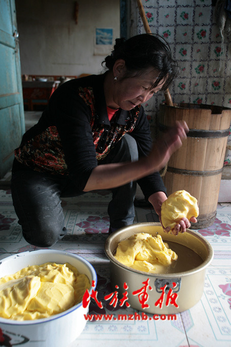 經(jīng)過(guò)反復(fù)搗動(dòng)、分離而制成酥油,并將其保存在牦牛胃制成的口袋里