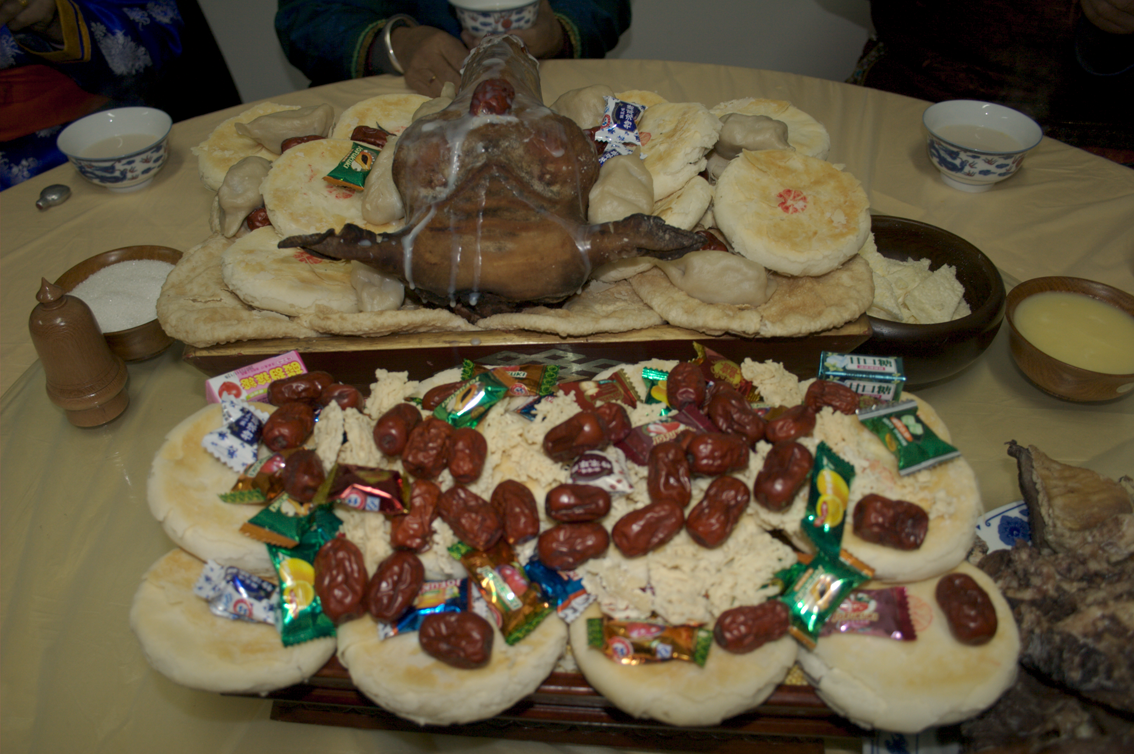 全羊席,又稱整羊席(蒙古語(yǔ)為“布禾勒”或“酥斯”),是蒙古人招待貴賓的傳統(tǒng)佳肴,也是蒙古民族最古老、最隆重的一道宴席,一般只在盛大宴會(huì)、隆重集會(huì)、舉行婚禮或接待高級(jí)貴賓時(shí)擺設(shè)。將整羊加工后擺在長(zhǎng)方形的大木盤里,像一只臥著的羊,肉味鮮美,香飄滿堂。賓客在進(jìn)餐前,還要舉行一定的儀式,高唱贊歌,朗誦獻(xiàn)整羊祝詞等。據(jù)文獻(xiàn)記載,成吉思汗曾設(shè)過(guò)全羊宴。忽必烈登基時(shí),也設(shè)全羊宴祭神祇、待賓客。至清代全羊宴更加盛行,現(xiàn)已成為蒙古民族風(fēng)格接待貴賓的名貴菜肴,馳名中外。