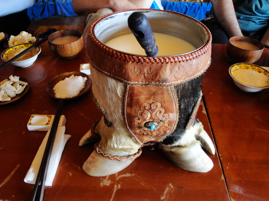 奶茶(蒙語(yǔ)叫“蘇臺(tái)柴”)是蒙古民族日常飲用的一種茶,也是蒙古人民招待客人的必備飲料。其做法,一般是將磚茶放入鍋內(nèi)熬成紫紅色,然后將鮮奶(除常用的牛奶外,還用羊奶或駝奶)大致以六比一的比例放入茶水中熬開,即成。隨其所好,可加鹽或加糖。奶茶營(yíng)養(yǎng)豐富,具有提神、開胃、助消化、解渴等功效。
