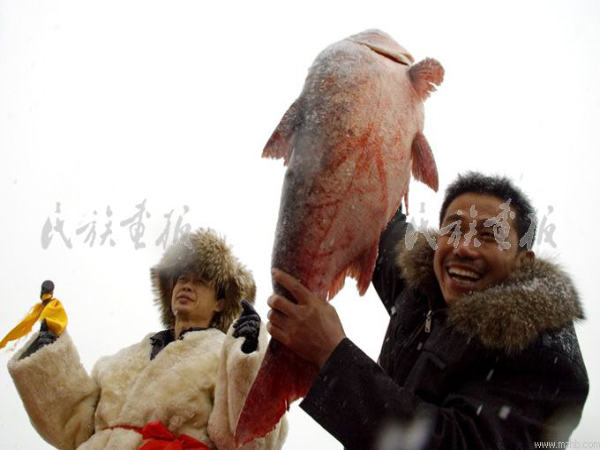 “祭湖”結(jié)束后, “魚把頭”帶領(lǐng)幾位漁工在剛才祭湖的冰面上,用冰镩鑿開一個1米左右的冰洞,“魚把頭”拿著抄撈子,在冰洞里攪和幾下,使勁往上一揚,只見一條活蹦亂跳的胖頭魚就被 撈出水面。經(jīng)過磅秤,重32斤,稱為“開湖頭魚”。經(jīng)過幾輪叫賣,這條“頭魚”以人 民幣8888元的價格被一位廣東來的游客買走。