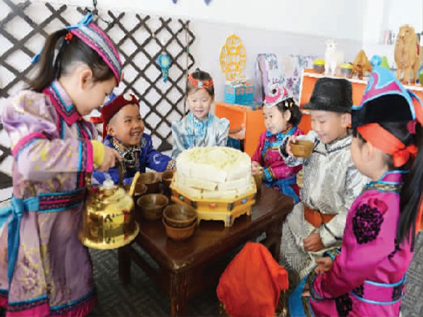 走進錫林郭勒盟鑲黃旗民族幼兒園,“賽白努,請坐、喝茶”等文明禮貌用語讓我們聽得無比親切。該幼兒園2009年開始開展“傳承蒙古族文化遺產(chǎn)”的課程。據(jù)了解,課程的內(nèi)容按照日常生活的習(xí)慣來展開故事情節(jié)。舞蹈、繪畫,都從幼兒的角度去設(shè)計,結(jié)合幼兒喜歡的童話故事、卡通圖片,將蒙古族文化滲透其中。課外要求家長帶領(lǐng)孩子走進牧區(qū)參加放牧、擠奶、接羔等勞動,從長輩那里學(xué)習(xí)繼承生產(chǎn)生活方式和技能。蒙古象棋、“吉日格”(鹿連兒)、“沙嘎”(羊拐子)等一些蒙古族傳統(tǒng)游戲不僅是智慧、意志和應(yīng)變能力的較量,更重要的是使民族的文化遺產(chǎn)得以傳承。