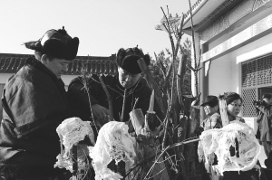 兩位年輕人把新鮮的羊油搭在火撐子上 白酒、點心、干果,長長的條案上,擺放著各式祭品 一名男子掏出煮熟...