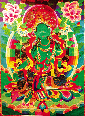 堆繡內容大多取材于佛教中的人物故事,也有許多傳說故事的畫面。堆繡注重人物形態(tài)的塑造,線條流暢、清晰,人物千姿百態(tài),活靈活現(xiàn)。它講究綢緞的選用配置,粗狂中顯細膩,點滴中見絕妙,色彩艷麗,裝飾性極強。黃南藏族自治州藏傳佛教寺廟——隆務寺神秘威嚴的殿堂里,掛滿了各種佛像,這些佛像都以細密嚴謹?shù)氖址ɡL制和堆繡而成,然后用彩緞裝裱成卷軸畫,也就是所謂的堆繡唐卡。堆繡過去主要用于藏傳佛教繡制佛像。堆繡唐卡的制作十分精細,色彩艷麗、層次分明,立體感極強,表現(xiàn)出手工藝人高超的技藝。
