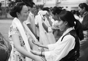藏族學(xué)生向來(lái)自浙江的支教老師表達(dá)祝福。 王麗煒攝