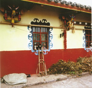 四川昭覺彝民民居獨有的牛頭裝飾。最能展現(xiàn)彝族建筑特色的要數(shù)前屋檐的挑拱了。屋檐的裝飾在建房時從墻上穿枋垂柱形成,少則3層,多則5層,上層垂柱上雕成牛角形托起屋檐的橫梁,下層垂柱上雕有形象逼真的裝飾牛角,垂柱的卡槽為牛蹄形、馬牙形,蹄尖向內(nèi),以示招財進寶。穿枋向上彎曲,與垂柱的牛蹄呼應,傳統(tǒng)的穿枋雕刻日月星辰、飛禽走獸和條形圖案。