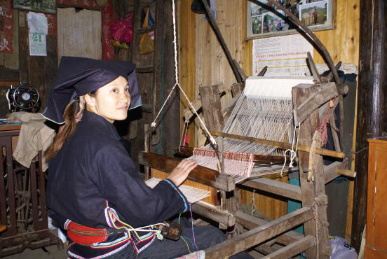 從前壯族鄉(xiāng)村,普遍掌握制作藍靛及印染方法。一般置一大缸,將藍草放入浸泡,加石灰使之分解、發(fā)酵,經(jīng)過化學變化,而后濾去殘渣,蒸發(fā)水分,凝成糊狀藍色染料。其間需不斷攪動,使色素充分化解?!懊康宀萘俳?,造成一百斤之靛為佳。”因產(chǎn)量較多,遠銷廣東。浸染時,將適量靛糊化于染缸中,同時將雞血藤搗碎加入。布要反復(fù)浸泡多次,晾泡結(jié)合,直到染為深藍色。其間雞血藤釋放出一種紫紅色的植物膠,將藍靛色素粘在纖維上,是色素耐水耐腐耐紫外線,不易褪色,并有若隱若現(xiàn)的亮點,結(jié)實美觀。這個過程,運用了化學分解法。
