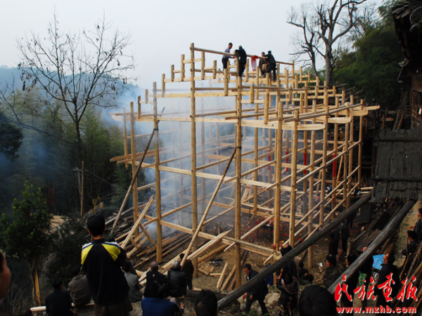 干欄式建筑是生活在“南嶺走廊”之貴州、廣西、廣東、湖南等地的布依族、苗族、瑤族、侗族等少數(shù)民族共有的民居樣式。圖為干欄式建筑的骨架結(jié)構(gòu)。楊昌銀攝影,引自民族畫報(bào)