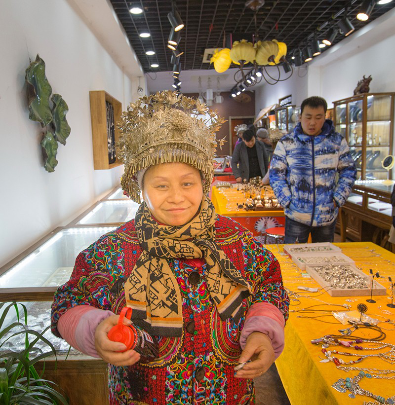 楊玉芬初到西安,是2008年來參加西部洽談會。那一次,她的苗族銀飾一天里賣了幾萬元,讓她十分驚喜。洽談會一結束,她一出來就直接打的,上去就問司機你們西安哪里最熱鬧???司機說當然是回民街啦!她便讓司機帶著直奔回民街,下了車,就地找了個攤位就擺起貨來。沒想到兩個小時就賣了3000多元。在西安生意這么好做??!楊玉芬當即決定不走了,鐵下心留在回民街。當初,在滿是小吃的回民街上突然出現(xiàn)這么一個穿著苗服的女子忙來忙去賣銀飾,的確顯得很扎眼。但楊玉芬不把自己當外人,很快融入了回民街,生意如同芝麻開花節(jié)節(jié)高,賣的品種越來越多,掙的錢也越來越多。她的攤位從小到大,從街邊升到室內。去年,楊玉芬干脆在離回民街入口很近的黃金地段租了一間幾十平米的大店鋪,徹底結束“練攤”的日子,名正言順開起了“苗奶奶”銀飾店。有著上千種精美銀飾的“苗奶奶”,今天已成為坊上的一道風景。