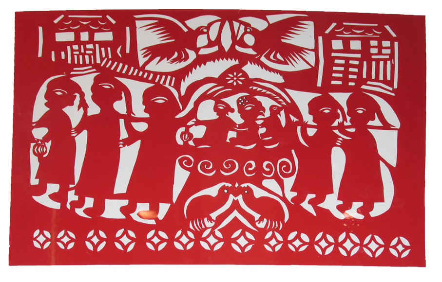 其實,這樣一種民間工藝,早在清代,就已堂而皇之地登上了朝廷大雅之堂。如皇帝舉行婚禮作洞房的神寧宮,墻壁就按滿族習俗裱紙,四角貼著雙喜字剪紙角花,頂棚中心貼著龍鳳團花剪紙。在宮殿兩旁的過道壁上也貼有角花。據(jù)說有人用紙剪成有鹿、鶴、松的“六合春”圖案,加以彩繪,貼于朝服覲見慈禧太后,連她都以為是繡出來的。
