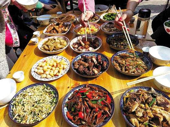 蔬菜大多制成酸萊。魚鮮包括鯉魚、鯽魚、草魚、鱔魚、泥鰍、小蝦、螃蟹、螺螄、蚌之類,可制成火烤稻花鯉、草魚羹、鮮炒鯽魚、吮棱螺、酸小蝦、酸螃蟹等風(fēng)味名肴。肉品主要是豬、牛、雞、鴨肉,吃法與漢族差別不大。瓜果有刺梅、獼猴桃、烏柿、野楊梅、野梨、藤梨、飽飯果、刺栗、大王泡,以及松村嫩皮、桑樹嫩皮、香草根等。其中,櫟木的果實(shí)可做成豆腐,“香樹”的皮可潔白牙齒,油茶樹上長的“茶泡”是天然的酸甜汁。野味包括鼠、蛇、蝌蚪、四腳蛇、幼蟬、幼蝗、土蜂蛹、石蛙、穿山甲、囡囡魚,以及吃松果長大的松香雞和松香豬,侗族均能巧加利用。菌耳方面有松菌和鮮美的雞絲凍菌,還有可制粑粑與粉絲的藤根、葛根,水田生長的細(xì)微苔絲,隨處可見的竹筍。飲料主要是家釀的米酒和“苦酒”,以及茶葉、果汁。據(jù)粗略估計,侗族的常見食料不少于五百種,天上飛的,水里游的,地上長的,草中爬的,只要能吃,無不取食。顯示出他們的聰明才智和很強(qiáng)的生存適應(yīng)能力。