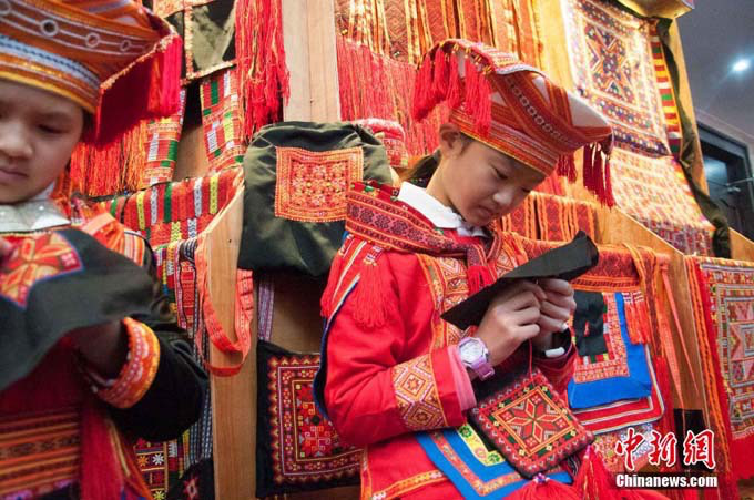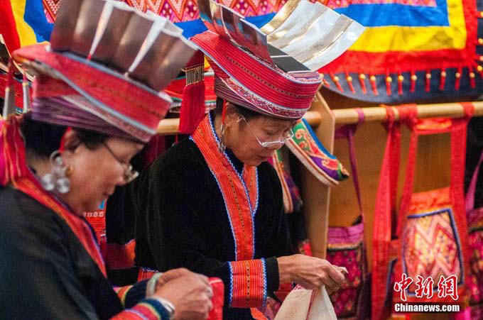 12月6日,在中國(guó)瑤族之鄉(xiāng)廣西金秀瑤族自治縣的盤(pán)王節(jié)上,當(dāng)?shù)乩弦惠叕幾鍕D女展示瑤族織繡