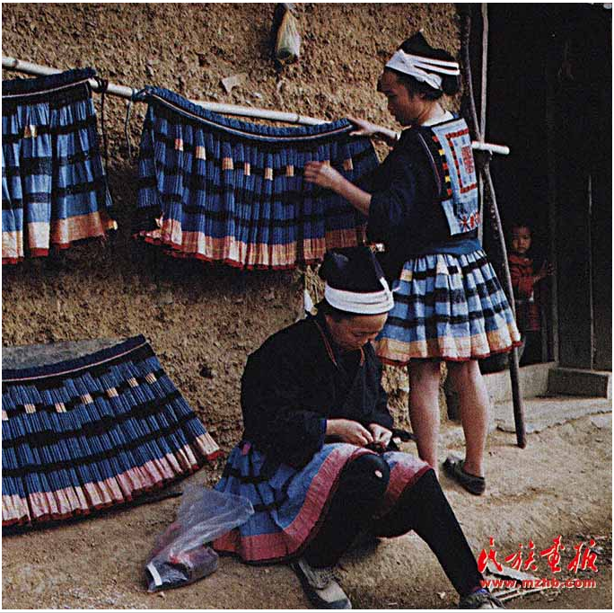 畫(huà)好的白布放進(jìn)盛有牛膠和藍(lán)靛的缸里浸染7— 10天,當(dāng)布匹染成深藍(lán)色時(shí)拿出,再放入盛有草木灰的熱水中,用灰水將粘膏脫去,清水洗凈后晾干,就成了一塊有白色花紋的蠟染布。白褲瑤婦女在白色的花紋上繡上彩色的絲線,再把三幅繡有圖案的布連成一塊4米長(zhǎng)的裙布,在裙腳邊上縫上一條手掌寬的黃色蠶絲,最后用2 條棉繩穿過(guò)裙頭勒緊,百褶裙就做成了。一條百褶裙從紡線到完成據(jù)說(shuō)需要兩到三年的時(shí)間。