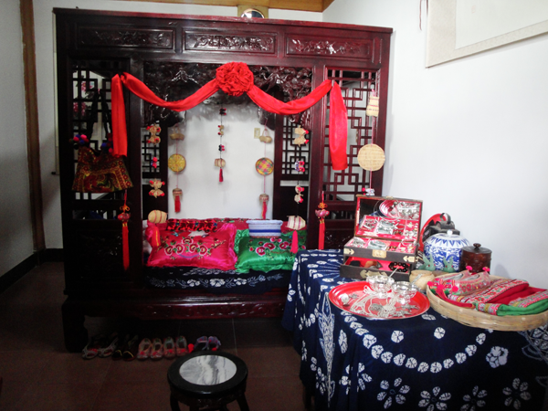 白族婚禮一般要舉行四天,第一天叫“預(yù)喜”,主要是殺豬宰羊,搭彩棚,迎喜神,接月老以及布置客堂、洞房和貼對(duì)聯(lián)等。第二天為“正喜”,嗩吶高奏,鑼鼓喧天,或騎馬或坐轎,迎親隊(duì)伍浩浩蕩蕩到女方家迎新娘,在完成了一系列妙趣橫生的禮儀后,經(jīng)媒人再三催請(qǐng)后,新娘才依依不舍,由其親兄長(zhǎng)背出門。新娘迎出門外后,新姑爺還要專門返回給丈母娘磕頭拜別,意為“回馬謝親”。新娘進(jìn)門時(shí)要跨火盆或馬鞍,表示興旺或平安,有人還要故意在火盆里灑上辣椒面,嗆得大家流淚,白語(yǔ)里“辣”叫“qil”,與“親”諧音,表示以后親親密密。新娘迎進(jìn)門后,拜堂前要梳妝,即女子換頭禮,請(qǐng)年高婦女為新婦梳頭,先戴鳳冠,然后換成紗帕,腳踩裝滿糧食的斗,寓意五谷豐登,魁星踢斗。斗中擺一桿秤,寓意新娘心像秤一樣公平,對(duì)丈夫?qū)Ω改敢灰曂?,又放置一把剪刀,表示新娘?duì)愛(ài)情的忠貞不二。第三天回門。新娘清晨早起,在別人幫助下“收頭”,將頭發(fā)梳成高高的髻,作為成人的標(biāo)志,然后由新郎陪同回娘家。新娘手中提著一籃糖果,有花生、瓜子、水果糖之類,路上遇到熟人和小孩,就抓給一把。這天新娘家要辦酒席招待女婿,女婿一一拜見(jiàn)岳家長(zhǎng)輩,新婚夫婦當(dāng)日返回男家。第四天酬客,折彩棚,招待幫忙的客人。