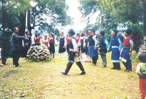 頌藥仙活動各村為陣,是一項以傳授藥物知識和防病方法為主題的歌舞活動。早早吃過晚飯后,人們集中到白天洗揀藥物的水邊,用青松和花草編扎的轎子抬上藥仙的肖像,敲鑼打鼓、載歌載舞,把藥仙抬到她的化身“定居”的山林中,舉行頌贊藥仙功績的儀式?;顒訄龅厮闹埽灞楦鞣N花枝,花枝上掛滿姑娘們精繡的荷包,荷包中裝的是各種治病的藥粉。場中央燃燒著熊熊篝火,火邊供著藥仙的肖像。參加活動的人,各持兩束用藥用植物編成的“花束”,在歌頭的帶領下,眾人手舞“花束”,環(huán)篝火踏歌而舞。用動聽的歌聲,歌唱藥仙嘗百草、治疾病的故事;介紹用中草藥防病、治病的知識……踏歌接近尾聲時,人們便把手中舞耍的“花束”丟進篝火中焚燒,象征把各自身上的病疾丟盡,實際上是借焚藥草來達到消毒防病的目的。