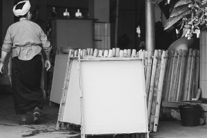 澆紙是在紙槽中進(jìn)行的,不但需要強(qiáng)勁的臂力,還需要相當(dāng)?shù)募?xì)心。在紙槽中舀水的時(shí)候,雙臂承受的重量不下10公斤,紙要澆得恰到好處,澆輕了紙就太薄,澆重了紙又太厚。太薄出不了好品相,太厚會(huì)增加成本。這是整個(gè)構(gòu)紙成品的關(guān)鍵,經(jīng)驗(yàn)老到的傣族老人,都不會(huì)在這道工序上馬虎。一雙手游走在澆紙槽,或輕輕拍打,或慢慢游弋,絮狀的纖維時(shí)而附著在手上,時(shí)而又歡呼雀躍地散開,頑皮得有點(diǎn)像芒團(tuán)村水塘邊遇上的那些孩子。憑感覺均勻了,老人這才輕輕將澆紙盤脫離水面,一眨眼功夫,一張構(gòu)紙便在盤上現(xiàn)出端倪。接下來(lái)的事就交給陽(yáng)光了,如果雨季來(lái)臨,構(gòu)紙就停止生產(chǎn)。所以說(shuō),芒團(tuán)構(gòu)紙常常浸漬著一種陽(yáng)光的味道。