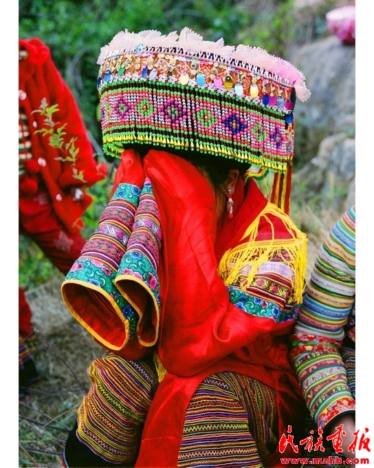 刮臉回來后,張正秀就由姐妹陪伴在閨房。屋外送親的酒席在熱鬧中開席時(shí),舅母就回到閨房里為她洗臉洗腳,改換嫁衣。按傳統(tǒng)習(xí)俗,要把新娘用過的水潑灑在閨房的地上,以示吉利。新娘穿上由親人縫制的繡花衣裙,從頭到腳煥然一新。穿戴整齊后,新娘由伴娘陪同坐在閨房門旁的草地上接受祝福。女方家請的懂禮儀的阿巴莫(司儀)手持菜花和松針葉在堂屋敬女方家神,告訴家神姑娘要出嫁了,并給前一天夜里來新娘家領(lǐng)親的兩位娃拿扒(證婚人)挎上兩條交叉打結(jié)的紅布,表示娃拿扒已承諾為女方家領(lǐng)親。