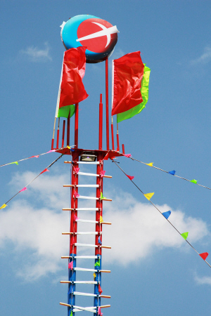 2011年,緬甸傈僳學會在密支那舉辦了第一屆世界傈僳闊時節(jié),第一次將十幾米高的弩弓木雕作為會徽。該木雕高高聳立于密支那郊區(qū)闊時節(jié)會場,還有印有傈僳族徽的紅旗插滿會場四周,高高飄揚,與巨型木雕相互輝映,構成了一個以弩弓木雕為核心,族徽紅旗環(huán)繞的闊時節(jié)會場空間。其內其外,傈僳族空間與非傈僳族空間區(qū)隔明顯。