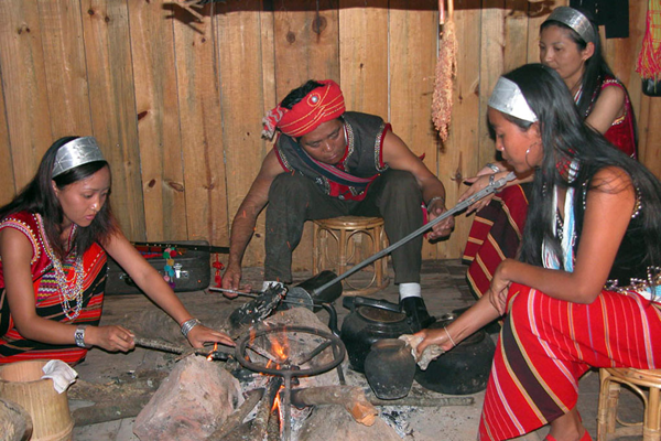 佤族普遍喜飲酒,喝苦茶。所飲用的酒都是自家釀制的“泡水酒”。常飲泡水酒不但于身體無(wú)害,反而有益健康。飲水酒成為佤族日常生活中主要的嗜好之一。喝酒時(shí)必須要請(qǐng)親友來(lái)家中共飲,主人給客人敬酒有一套規(guī)矩:必須一一敬酒。敬酒時(shí),雙手捧竹酒筒,走到客人面前,弓身把酒筒從自己胸前按下再向上舉到客人嘴邊,主人喝一口,最后敬給客人喝干。如此一一敬酒,直至敬完所有在場(chǎng)的人,漏敬一個(gè),都會(huì)被認(rèn)為是不合“阿佤理”的。敬酒時(shí),第一個(gè)被敬酒的人,通常是在場(chǎng)的客人中最被尊重的人。他接過(guò)酒后,先要用右手沾出幾滴,滴在地上,并口念祝福的語(yǔ)言,表示敬主人的祖先(圖為用竹筒制水酒,劉軍攝)。