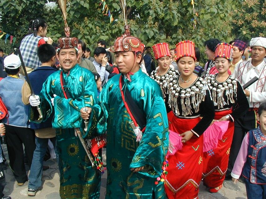 目瑙節(jié):又稱“總戈”,景頗語音譯,意思是“大伙跳舞”。目瑙節(jié)是景頗族最盛大的傳統(tǒng)節(jié)日,一般于每年農(nóng)歷正月十五以后的九天內(nèi)擇雙日舉行,節(jié)期三至五天不等。目瑙作為一種大型的群眾性歌舞活動(dòng),由來已久,歷史上,每逢豐年,出征、凱旋、婚姻嫁娶、敬祭鬼神等重要活動(dòng),均要跳“目瑙”。景頗族的“目瑙縱歌”原來是一種融宗教和文化習(xí)俗為一體的傳統(tǒng)慶典。隨著社會(huì)的發(fā)展,逐漸演化為各種不同類別的“目瑙”。大致有以下幾種:①“歲目瑙”,家庭財(cái)源茂盛,人丁興旺時(shí)舉行;②“布當(dāng)目瑙”,征戰(zhàn)取得勝利時(shí)舉行;③“貢冉目瑙”,同胞兄弟分家自立門戶時(shí)舉行;④“騰肯目瑙”,新建房屋住所落成時(shí)舉行;⑤“空然目瑙”貴族家娶親辦婚禮時(shí)舉行;⑥“達(dá)如目瑙”,出征時(shí)舉行;⑦“昔目瑙”,有名望的長者去世送葬時(shí)舉行;⑧“柱目瑙”,祭奠“木代”神時(shí)舉行。不同類別的“目瑙”都有特定的內(nèi)容和表現(xiàn)形式,但有一個(gè)共同點(diǎn)就是整個(gè)過程都是由“瑙雙”(領(lǐng)舞)隊(duì)和“瑙巴”(表演)隊(duì)組成的舞隊(duì)來表現(xiàn)和完成的。每逢目瑙節(jié)日,村村寨寨的景頗人身著節(jié)日盛裝,紛紛從四面八方涌入目瑙廣場(chǎng)。廣場(chǎng)上人山人海,氣氛熱烈歡快而不失莊嚴(yán)古樸的特色。廣場(chǎng)中央高豎著四根長約4米的目瑙柱,亦稱雌雄柱,中間兩根為陰,外面兩根為陽,上面皆繪有精美而富有象征意義的圖案:右邊柱上往往繪以蕨菜花紋,象征團(tuán)結(jié)奮進(jìn);左邊常畫回紋構(gòu)成若干個(gè)四方形,并涂以不同顏色,表示景頗族的遷徙路線;中間兩根柱子之間,交叉著兩把長刀,為景頗民族驍勇強(qiáng)悍、堅(jiān)強(qiáng)剛毅性格的具體標(biāo)志。目瑙柱的左側(cè)立著一個(gè)方形架子,上層是吹嗩吶的座位;前面掛著一個(gè)兩米長的大皮鼓和一面直徑一米多的大芒鑼,供跳舞時(shí)伴奏用。廣場(chǎng)四周用竹籬笆圍起,目的是為了防止野鬼的侵入和牲畜的干擾。舞蹈開始時(shí),鼓樂齊鳴,由兩位德高望重且又熟悉目瑙舞路線的老人身穿大龍袍,頭戴飾有孔雀、野雞羽毛和野豬牙齒的目腦帽,手持長刀領(lǐng)頭,后面跟著背銅炮和持長刀的隊(duì)伍,婦女們拿著扇子或彩帕跟在最后,邊歌邊舞,熱鬧非凡。參舞者少則百多人,多則幾千人,從清晨到日暮,以日暮到清晨,通宵達(dá)旦,其間舞者跳累時(shí)可自動(dòng)退場(chǎng)小歇片刻,然后繼續(xù)登場(chǎng)舞蹈。“目瑙縱歌”作為一個(gè)民族的傳統(tǒng)活動(dòng)發(fā)展至今,宗教色彩和類別已日益淡化,它已成為景頗族約定俗成的傳統(tǒng)節(jié)日,統(tǒng)稱為“統(tǒng)肯(傳統(tǒng))目瑙”并賦予了新的內(nèi)涵,其內(nèi)容和形式都是展示一個(gè)民族的傳統(tǒng)文化,反映今天的新生活和對(duì)未來的美好向往。