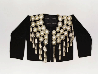 民族文化宮博物館收藏的這件銀飾“孔雀衣”,是景頗族女子盛裝時的一種服飾,征集于云南省德宏傣族景頗族自治州隴川縣,時間為20世紀50年代。這件銀飾“孔雀衣”長40厘米,胸圍108厘米,黑色平絨布制作而成,圓領(lǐng)對襟,領(lǐng)部、肩部和胸部墜銀泡、銀鏈、銀穗裝飾,黑白兩色相映成趣,精致華美。銀泡為三圈,由里至外逐圈增大,里層銀泡直徑約2厘米,最外層銀泡直徑約3厘米。外圈銀泡每個上墜有三角型銀片打制的銀穗,每串分三層,每層分別掛2、4、6個不等的三角型銀片。整個上衣幾乎被銀泡、銀鏈和銀穗遮蓋,穿上銀飾“孔雀衣”,銀泡在太陽的照射下銀光閃閃,行動起來身動銀搖,悅耳動聽。