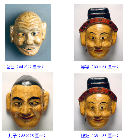 面具,土族語(yǔ)稱“面古子”,是土族在表演某些儀式舞蹈時(shí)用以表現(xiàn)一定內(nèi)涵的道具。按形制可分為假面和假頭兩大類。其中最具代表性的當(dāng)屬“納頓”節(jié)日當(dāng)中使用的面具。民族文化宮博物館珍藏了三組土族“納頓”面具,分別為表演“莊稼其”時(shí)的公公、婆婆、兒子、媳婦的假面面具;表演“殺虎將”時(shí)的殺虎將、虎、猴、牛的假面、假頭面具;表演三國(guó)演義人物關(guān)羽、張飛、曹操、呂布的假面面具。面具材質(zhì)均為布胎, 20世紀(jì)80年代征集于青海省海東市民和回族土族自治縣。