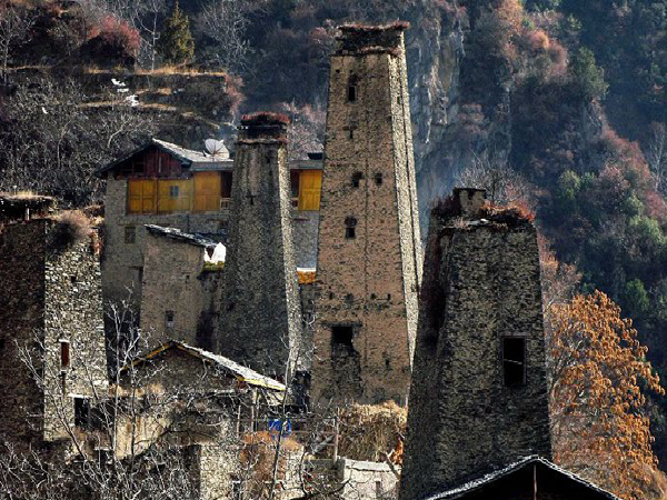 在羌語(yǔ)中,碉樓被稱為“邛籠”,意為美麗、高貴的房子,早在2000年前《后漢書(shū)·西南夷傳》就有羌族人“依山居止,壘石為屋,高者至十余丈”的記載。碉樓的高度在十米至三十米之間,用于御敵、貯存糧食和柴草。碉樓有四角、六角、八角幾形式,有的高達(dá)十三四層。建筑材料是石片和黃泥土,墻基深1.35米,以石片砌成。石墻內(nèi)側(cè)與地面垂直,外側(cè)由下而上向內(nèi)稍傾斜。修建時(shí)不繪圖、吊線、柱架支撐,全憑高超的技藝與經(jīng)驗(yàn)。建筑穩(wěn)固牢靠,經(jīng)久不衰。自唐朝來(lái),羌族人民因各種原因向西北遷移,到了西藏和青海,所以現(xiàn)在,羌族碉樓也往往被稱為藏族碉樓。