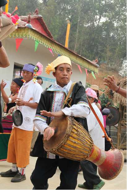 新年到時,漥墨寨的布朗族人們事先就發(fā)出通知,邀請外寨人來一起“跳歌”,在間隙時間也常常有兩寨人集體賽唱歌,誰輸了誰就得出豬頭請客,在一陣生動詼諧的對唱以后,人們又繼續(xù)“跳歌”,往往通宵不散,難解難分。