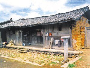 梁河縣九保鄉(xiāng)的阿昌族民居也為三合院,正房的堂屋大都是敞開(kāi)式,裝飾簡(jiǎn)單,左右?guī)烤o湊,院落很小。兩側(cè)廂房樓下,一邊是廚房,一邊是豬圈、牛欄;樓上,一邊是未婚子女的臥室,一邊存放糧食、雜物。