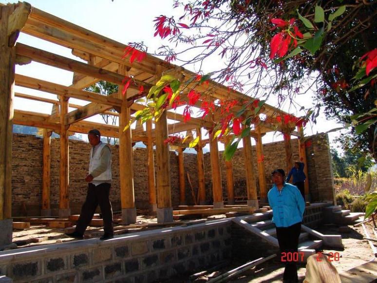 阿昌族建房傳統(tǒng)用工多是相互幫忙,全村協(xié)作,只吃飯而不付酬。建房一般分為“選材備料”“看風(fēng)水擇房基”“動(dòng)土奠基” “立柱成屋”等幾大程序。