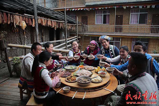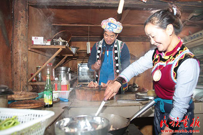早上,老姆登村73歲的怒族老人斯普早早起來(lái)招呼兒子郁伍林、兒媳魯春花:“春節(jié)快放假了,客棧的生意會(huì)忙得不可開(kāi)交,趁著現(xiàn)在客人不多,家里人先吃一頓團(tuán)圓飯吧?!彼蛊绽习樵缒赀^(guò)世,7個(gè)兒女中老五郁伍林在身邊照顧她?!斑^(guò)去在春節(jié)才能吃上一頓好飯菜,也要準(zhǔn)備很長(zhǎng)時(shí)間,現(xiàn)在每天都有好吃的,天天在過(guò)年,多虧了黨的好政策?!闭f(shuō)起今天的幸福生活,生在舊社會(huì)的斯普感慨萬(wàn)千。
