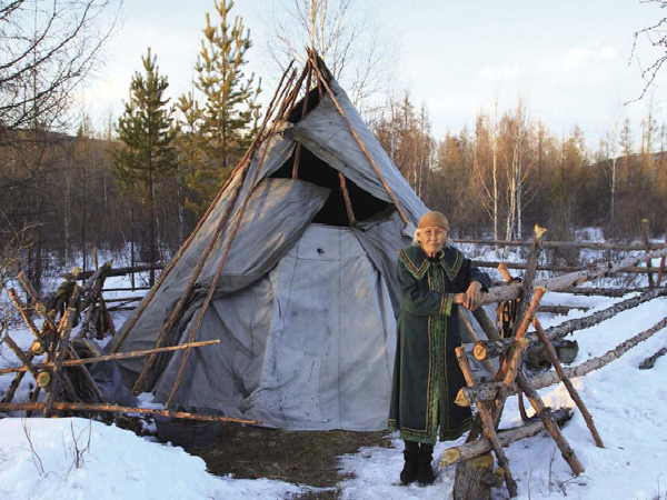 撮羅子的選址,是在地勢較高、陽光能照射到而且水和柴草就近可取的平坦之處。其蓋造方法,是用三五根約碗口粗細上有枝杈的木桿,相互交合搭成上聚下開的骨架,然后再用30根左右木桿搭在骨架之間捆綁固定,在南面(或東面)留出門,即基本成型。木桿搭起的只是“屋架”,外面還要覆蓋才能遮風擋雨。按照季節(jié)的不同,分別用樺樹皮、草簾子和犴、狍等獸皮,做成自上而下一層壓一層的圍子,綁在木桿上,門簾則夏用草或樹條編,冬用狍皮做成。