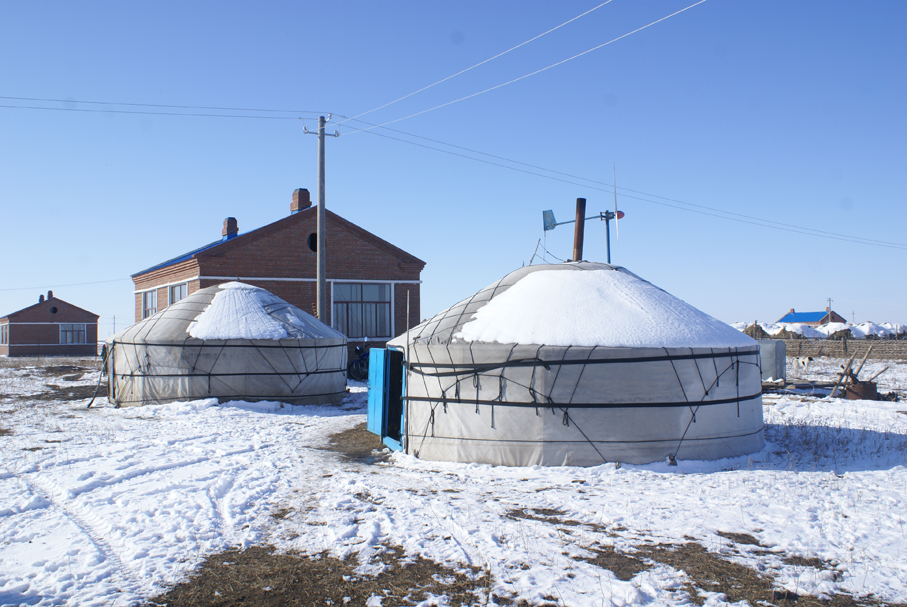 牧區(qū)主要的住房是“蒙古包”,鄂溫克人稱住房為“糾”,分別有“奧布海糾”和“俄儒格糾”。前者是一種形式簡陋的蒙古包式的住房,一般為打獵、拉腳、打羊草時的臨時住房,或為經(jīng)濟困難人家迫不得已時所居住。建造“奧布海糾”需要二三十根榆木桿子,頂端用繩子結(jié)在一起,下端插進地里形成“糾”的架,用葦子搭蓋出呈傘狀的棚房。這種房早期沒有定形的門,一般向南開一小口出入,僅以葦捆及氈子作門。后來“奧布?!币惭b置頂孔,材料是榆木和柳木,鑿出現(xiàn)代蒙古包的包頂。圓頂?shù)倪吘壣香@有小孔,以便插進木桿,成錐形。同時用葦子搭蓋成屋,冬季門里掛上一層氈子防寒?!岸砣甯窦m”也就是現(xiàn)在所稱的“蒙古包”,因為圓孔屋頂而得名。蒙古包的木架是用上、中、下三節(jié)結(jié)構(gòu)組成而成,外面的擋簾根據(jù)季節(jié)不同而樣式不同,夏季采用柳條串成簾圍在包外,用蘆葦串成傘形簾,蓋在上面擋雨。冬季則用帆布外加氈子圍嚴,以保包內(nèi)溫度,近年冬季在包內(nèi)床下搭熱炕。蒙古包一般選在陽坡、地勢較高、用水方便、靠近牧場的地方搭蓋。在搭蓋蒙古包時,雨季要搭得斜度大些,以防漏雨;冬季為免受強風吹襲,則搭建的斜度小。蒙古包內(nèi)置有床、爐子,有木箱柜、桌子等用具。近年來,隨著經(jīng)濟的發(fā)展,住土房、磚房的越來越多。值得一提的是鄂溫克族的牧民雖無固定住所,卻有固定建筑,那就是他們的倉庫。鄂溫克族的倉庫極為奇特:先砍去相鄰兩棵大樹的樹梢,作為柱子,然后用木頭壘出一間懸空的倉庫,地上斜豎一根砍有階梯的木柱為梯。倉庫中存放食品、獵物、衣服、用具等。牧民從不上鎖,其他獵人可任意取用,事后如數(shù)歸還即可。