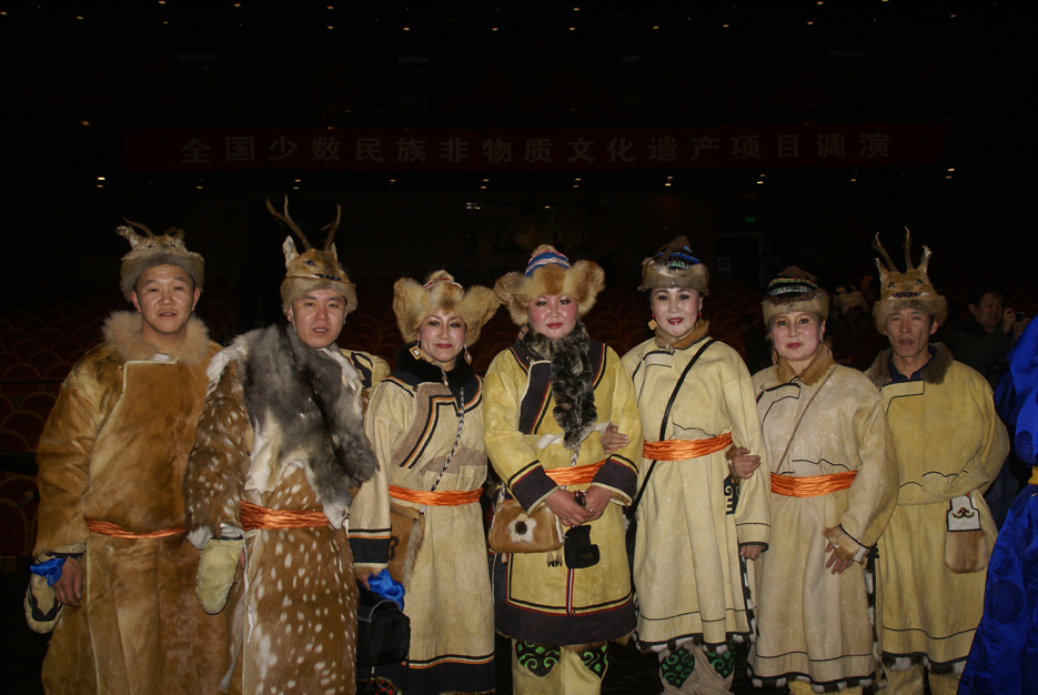 鄂倫春族的傳統(tǒng)服裝以袍式為主,冬季穿“蘇恩”?!疤K恩”是用冬季絨毛狍皮縫制的右任長袍,小立領(lǐng),襟邊、下擺和袖口用黑色皮鑲嵌云卷花紋等邊飾,女袍還要作環(huán)肩裝飾。為便于奔跑和騎馬,“蘇恩”都有開衩,衩口裝飾圖案豐富多彩。夏天穿用夏季沙毛狍皮制作的短袍或坎肩,布匹傳入以后穿布袍。 男子下身穿狍皮短褲,褲腿過膝,樣式如老式免襠褲,后來改穿長褲。出獵時(shí)褲子上面還要穿套褲。套褲無襠,呈筒狀,上角釘有皮條,系在腰帶上。一般用夏季的狍皮縫制,因?yàn)橄募镜尼笃ぐ搴衲湍?,也有用鹿皮縫制的。婦女的褲子樣式比較獨(dú)特,長至腳面,比男褲瘦些,腰兩側(cè)有開衩,前面有兜肚,兜肚頂端釘皮條,系在脖子上。這樣的褲子,既保暖又便于騎馬,可以護(hù)住前心,又起到了乳罩的作用。講究的人還在褲子兩側(cè)和褲腳處繡上花邊圖案。