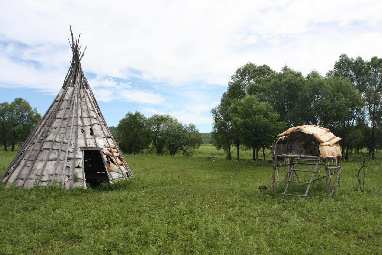 游獵時期居無定所,所以鄂倫春人居住的房屋是便攜式的“斜仁柱”?!靶比手睘槎鮽惔赫Z,意為木桿房屋。所...