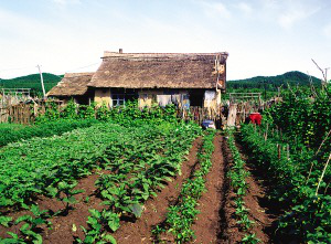 赫哲族人多用鍬把粗的柞木夾成障子,形成院落。房屋前面留塊院子,養(yǎng)雞、豬,放醬缸、農(nóng)具,碼著成排的木柈子垛;房后的菜園子較大,種些架豆角、黃瓜、茄子、小蔥、辣椒、西紅柿等蔬菜。黑龍江同江市街津口村的街道東西走向,道南的房子從后面開門繞過山墻進院,菜園子在前院;道北的房子從前門穿過菜園子邊的巷道到前院再進屋。