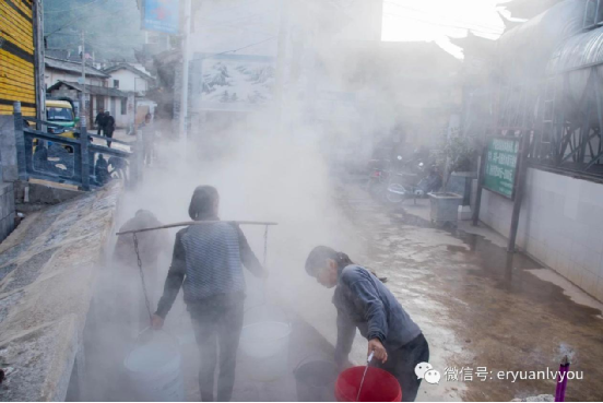 (洱源多處地下熱水自然流出地表,當(dāng)?shù)厝擞性缤砣∮脽崴膫鹘y(tǒng)習(xí)慣)