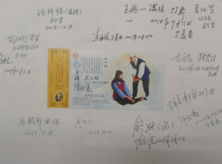 在采集口述影像錄音資料的同時,項目組還收集了大量的珍貴歷史照片以及相關(guān)文物。值得一提的是,他們設(shè)計了一種非常有特色的受訪者簽名簿,中間貼著繪有56個民族的音樂舞蹈圖案的首日封或明信片,四周簽上受訪者的人名簽名字、民族特征,有些還用民族文字書寫,體現(xiàn)了中華各民族團結(jié)在一起的精神風貌。簽名簿有厚厚的幾大本,設(shè)計精美,承載著民族工作口述史資源采集的經(jīng)歷,具有豐富的文化內(nèi)涵和博物館收藏價值。